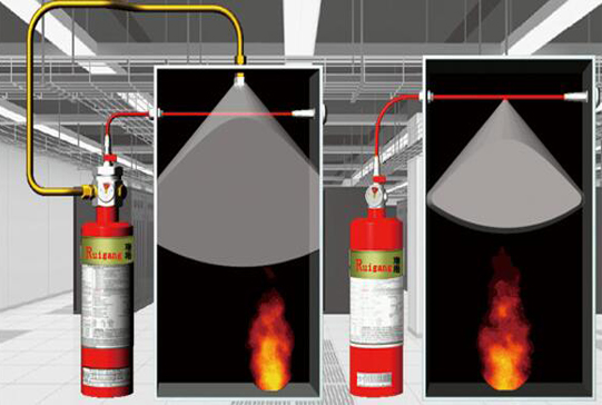 火探管通過容器閥連接到滅火劑容器上,進行火源探測,遇火時火探管爆破,利用火探管中的壓力下降,啟動容器閥,通過釋放管至噴嘴把滅火劑釋放出來。